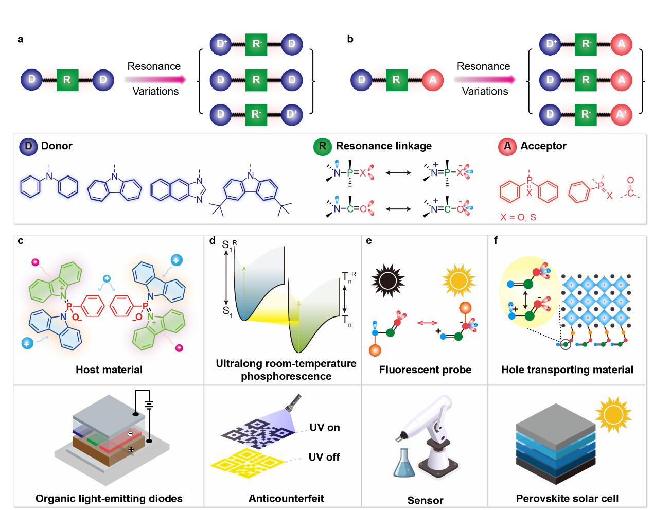 在器件应用层面,RVDA策略展现出多功能性:在有机发光二极管领域,RVDA分子作为器件主体材料,通过共振动态互变获得高且平衡的载流子传输能力,显著提升器件亮度和效率;在有机超长室温磷光领域,其共振变化可以动态调控单线态-三线态能级差和自旋轨道耦合,促进系间窜越过程,实现高效三线态激子生成,为时间分辨信息加密和可重写智能防伪技术提供新的材料体系;在荧光传感领域,RVDA分子通过共振互变增强光诱导电子转移过程,实现对爆炸物等目标分子的高灵敏度检测;在钙钛矿太阳能电池领域,RVDA分子作为空穴传输材料,通过与未配位Pb2+形成原位配位作用,有效钝化缺陷、调控钙钛矿晶格生长,同时优化能级结构提升空穴提取与传输效率,从而实现器件效率与稳定性的协同提升。